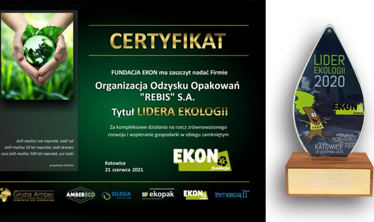 W dniu 1 lipca 2021 roku Fundacja EKON, jako organizator „eko – kampanii społecznej EKON” (www.kampania-ekon.pl), miała zaszczyt uhonorować Organizację Odzysku Opakowań REBIS S.A. tytułem „LIDERA EKOLOGII 2020” za wkład na rzecz budowy gospodarki niskoemisyjnej i zasobooszczędnej. Organizacja..
