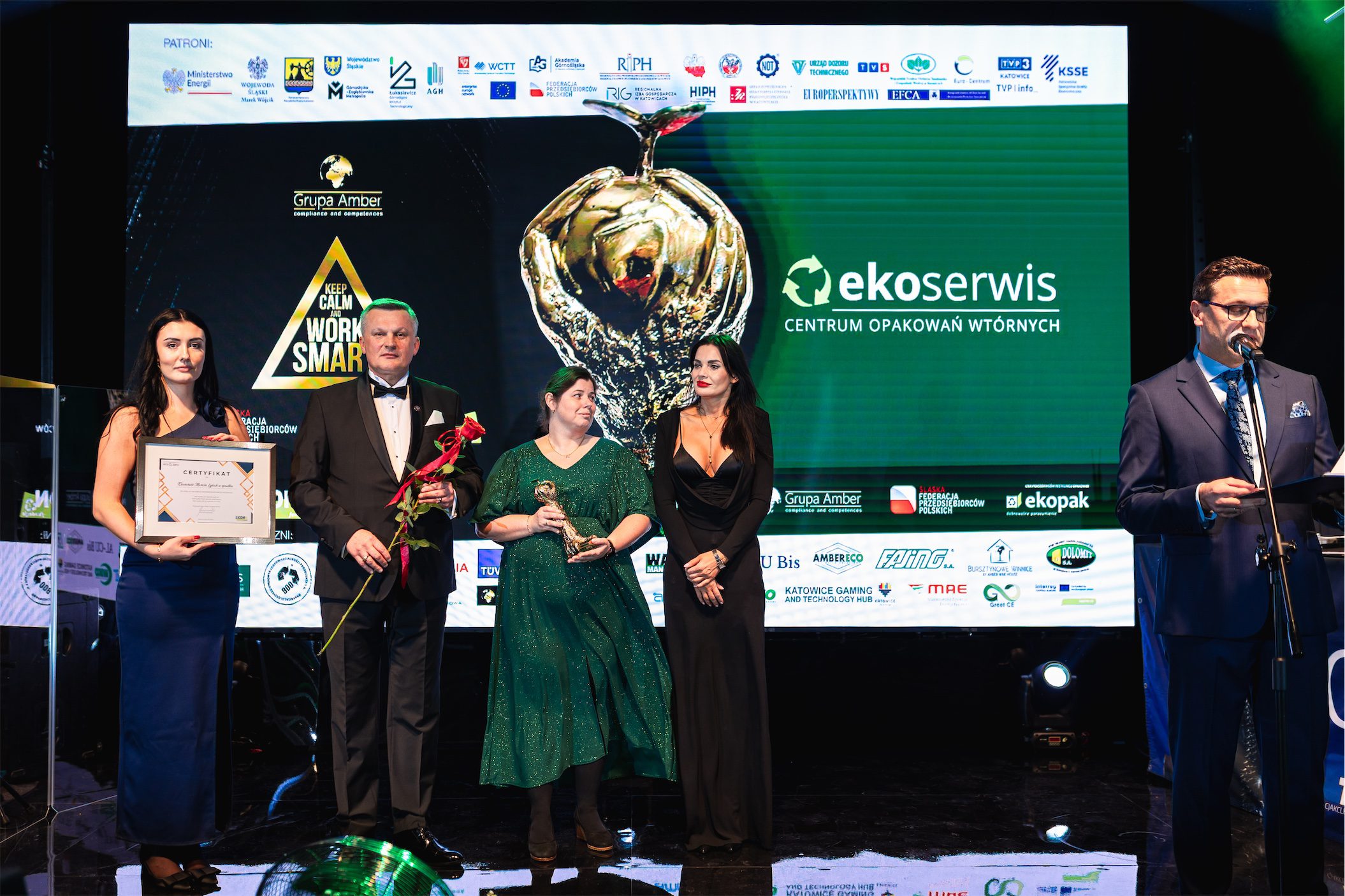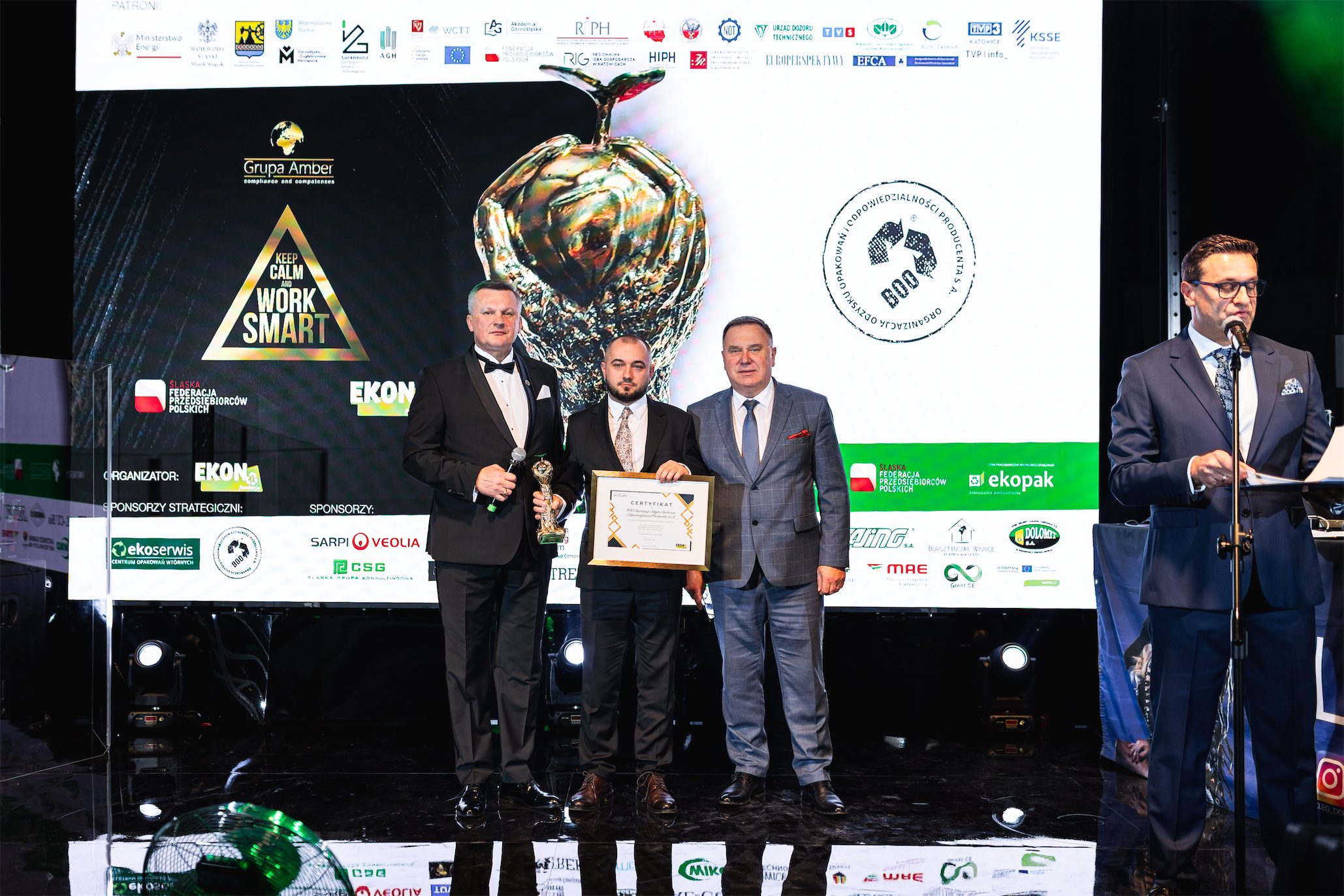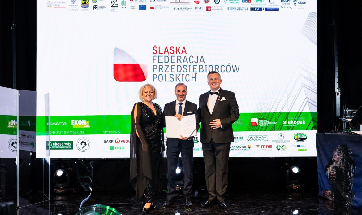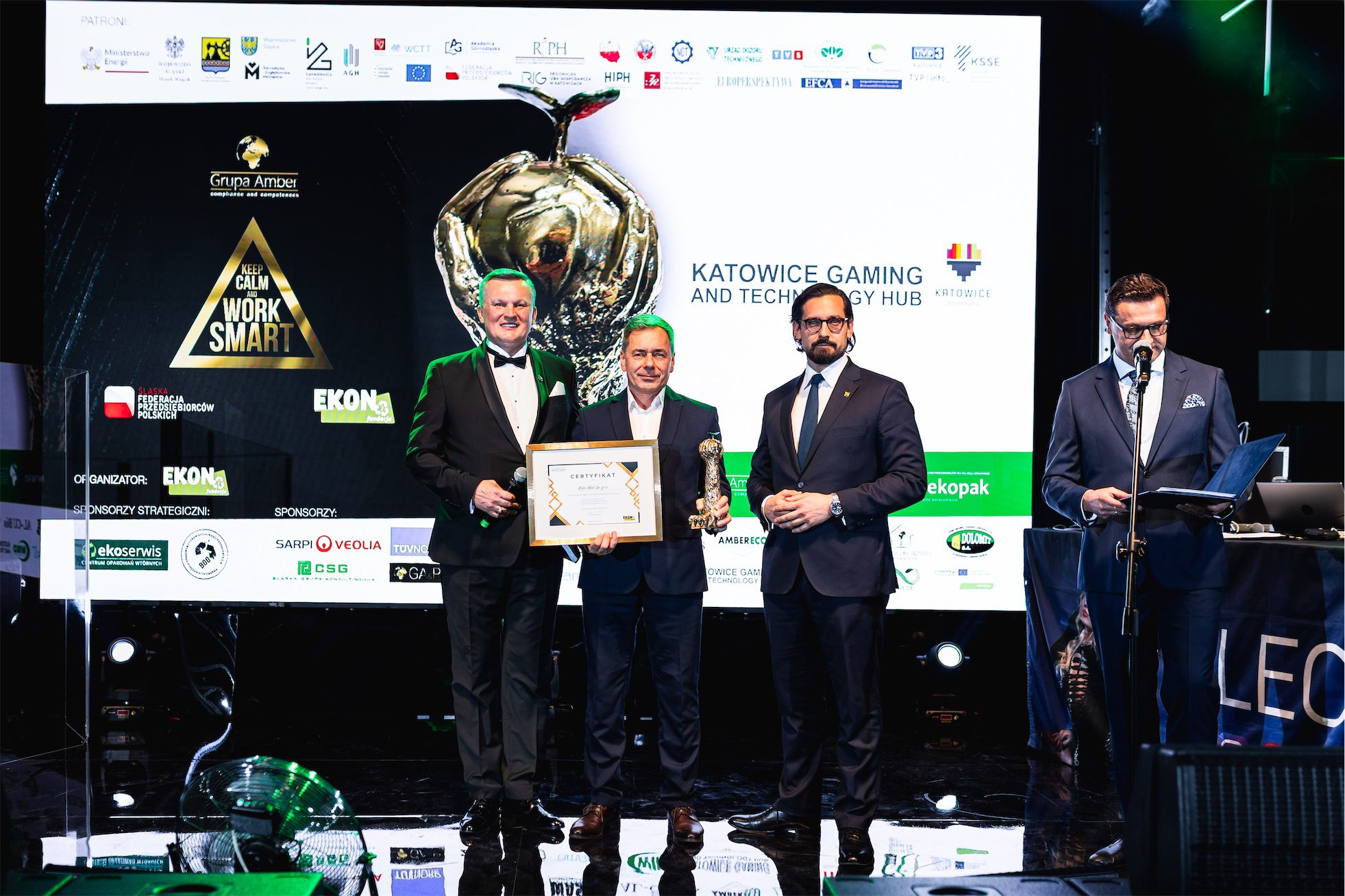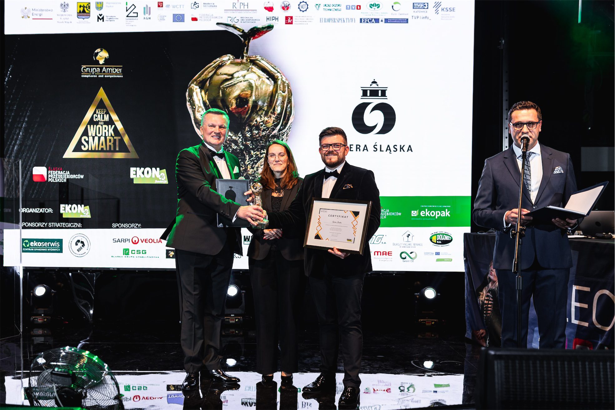 Wieczór miał jednocześnie wymiar symboliczny, ponieważ świętowano 10-lecie działalności Fundacji EKON. Jubileusz ten był nie tylko okazją do świętowania, lecz przede wszystkim do refleksji nad drogą, jaką Fundacja przeszła przez ostatnią dekadę, oraz nad wpływem, jaki jej działania wywarły na świadomość społeczną, edukację ekologiczną i dialog międzysektorowy. Szczególne miejsce w historii Fundacji zajmuje 10-letnia współpraca z firmą Veolia Hazardous Waste Europe, znana wcześniej jako Sarpi Veolia, która od lat kosenkwentnie wspiera działania Fundacji w obszarze odpowiedzialnego gospodarowania odpadami i edukacji ekologicznej. Z okazji jubileuszu firma Veolia Hazardous Waste Europe została uhonorowana specjalną statuetką, stanowiącą wyraz wdzięczności za wieloletnie zaangażowanie oraz partnerskie podejście.